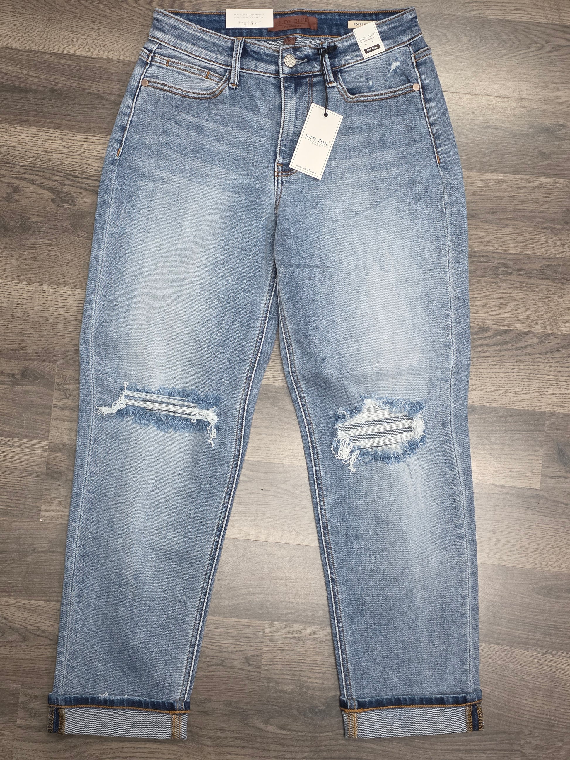 Laid-back, comfy, and perfectly on trend 💙 These mid-rise boyfriend jeans from Judy Blue feature a relaxed fit with distressed detailing and a cuffed hem for that effortless, lived-in look.