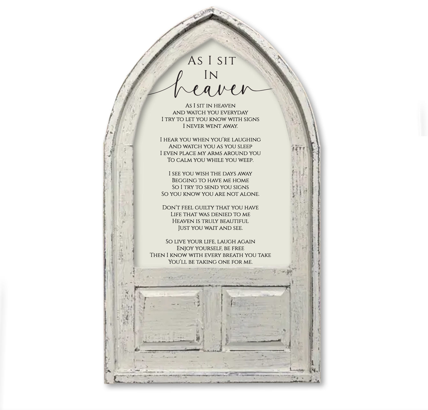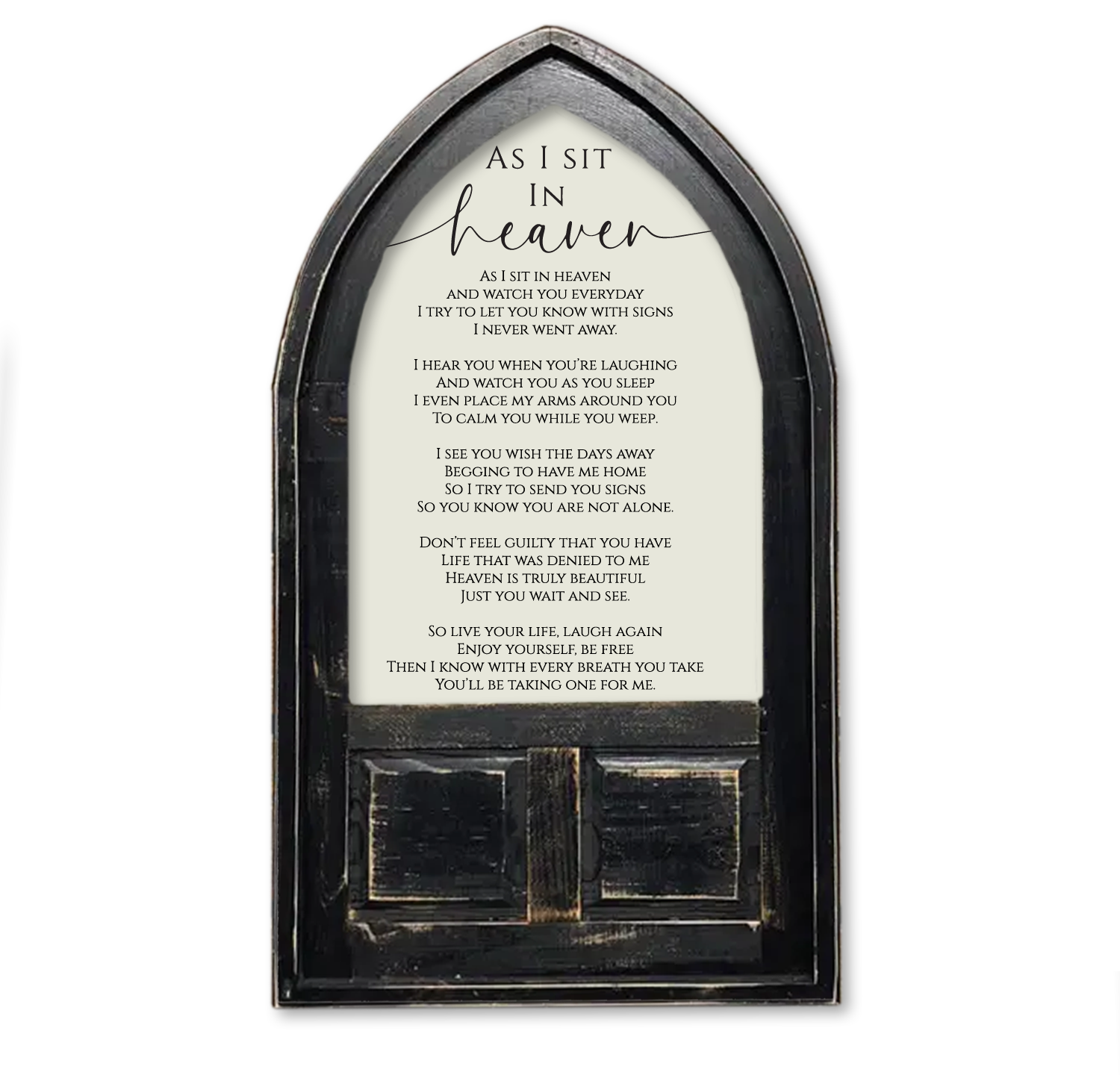 Arched faux window framed canvas verse. Hand distressed for a vintage/reclaimed look. Measures approx. 32"x18"x2". Must be ordered in multiples of 2.