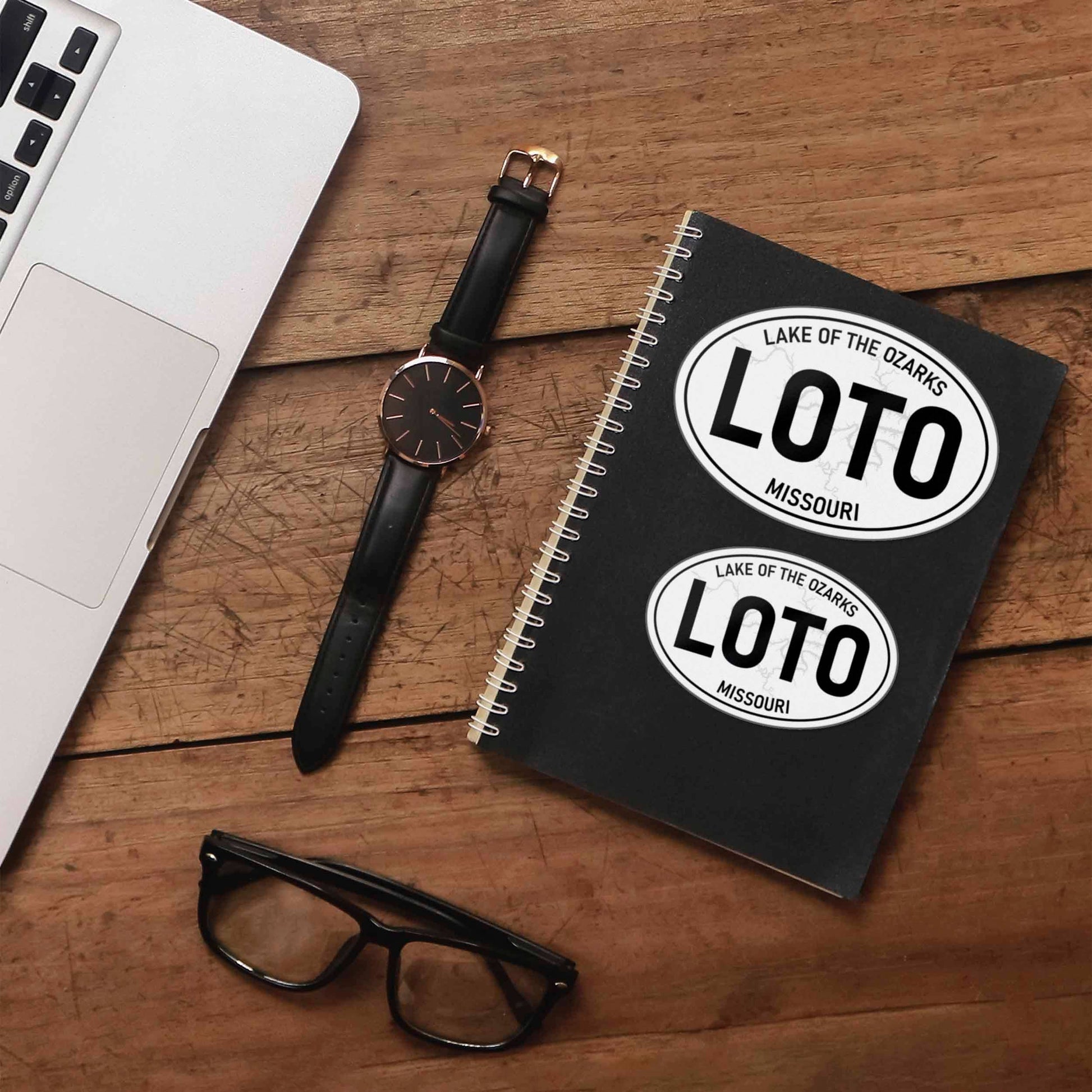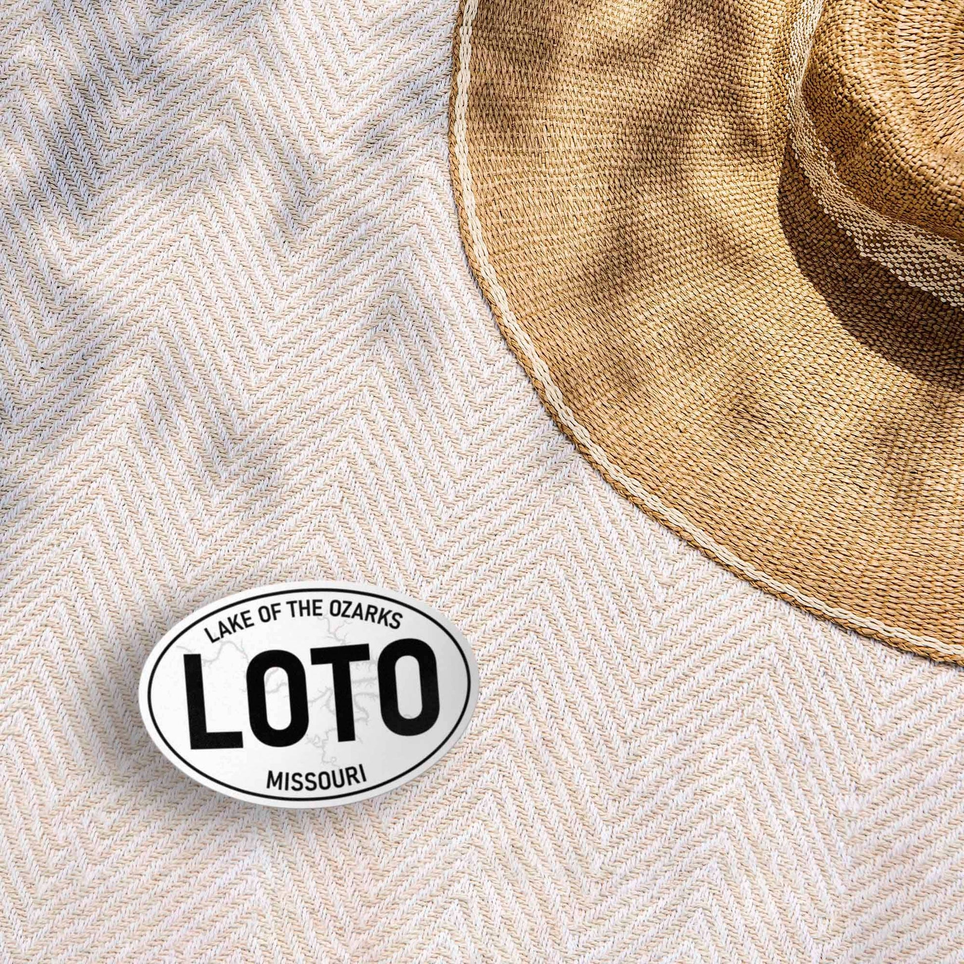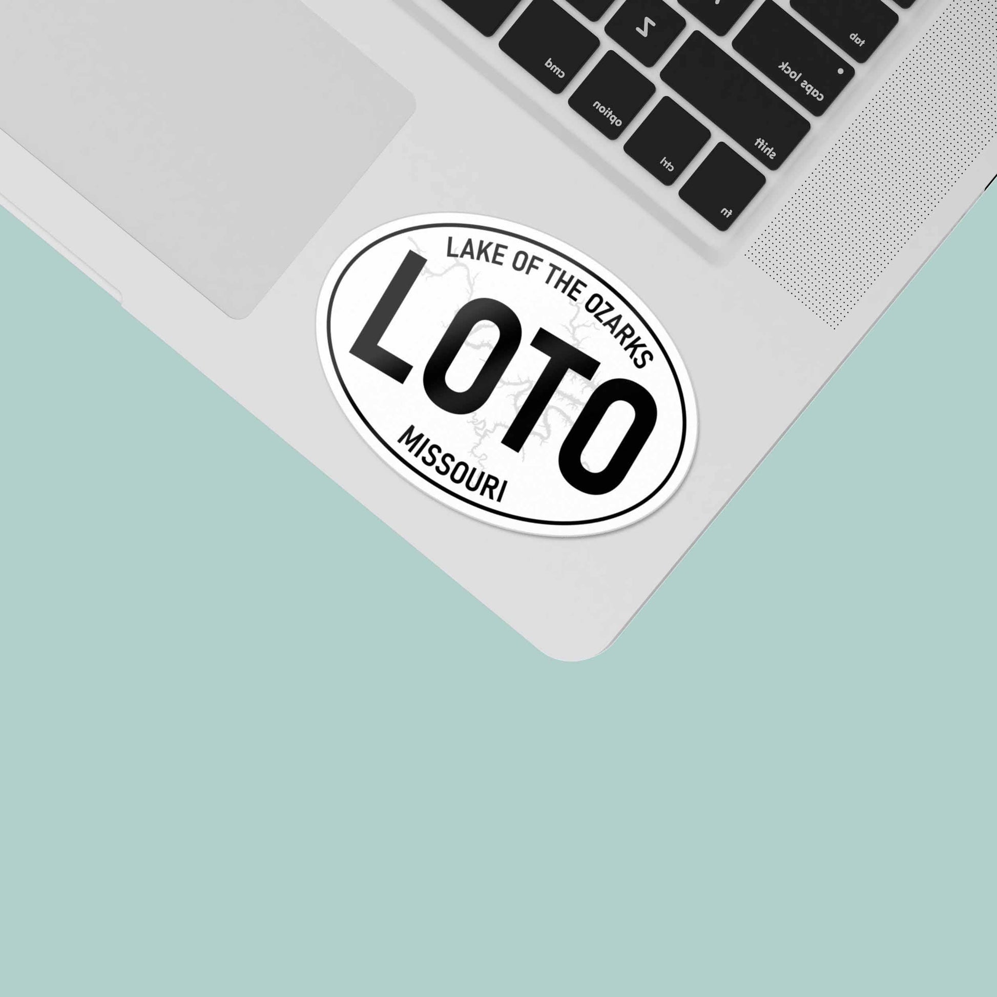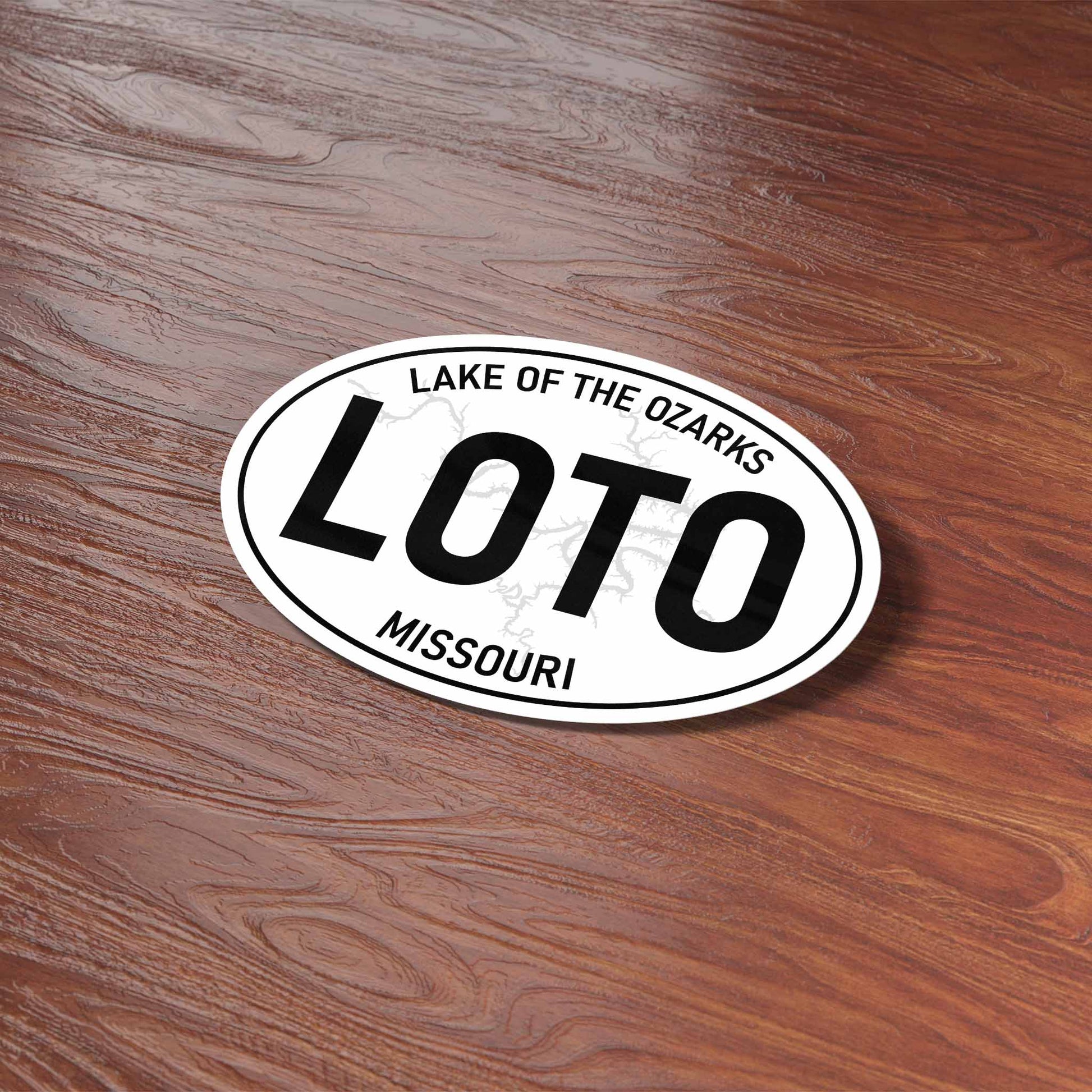 Lake of the Ozarks white oval stickers, 2 sizes: 3" wide laptop decal or 4" bumper sticker size. Durable die-cut vinyl decal with matte UV-resistant coating. Waterproof & weatherproof for indoor & outdoor use. Made in USA.