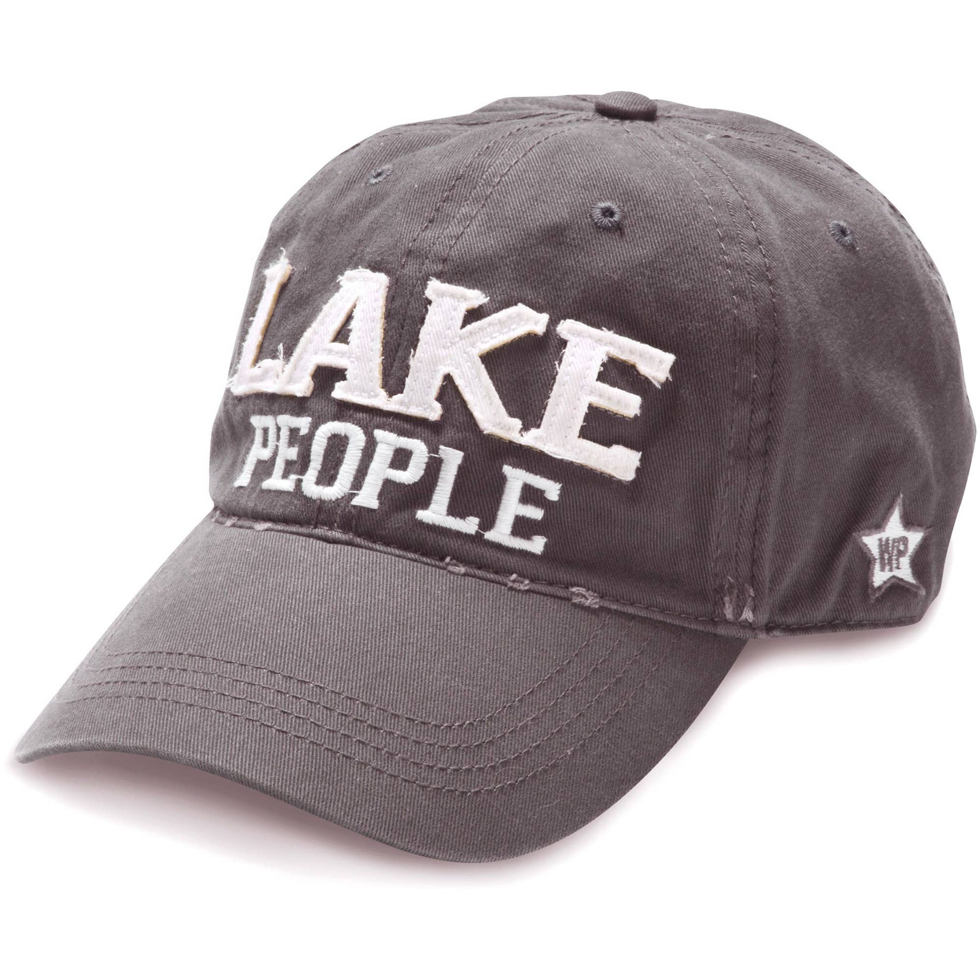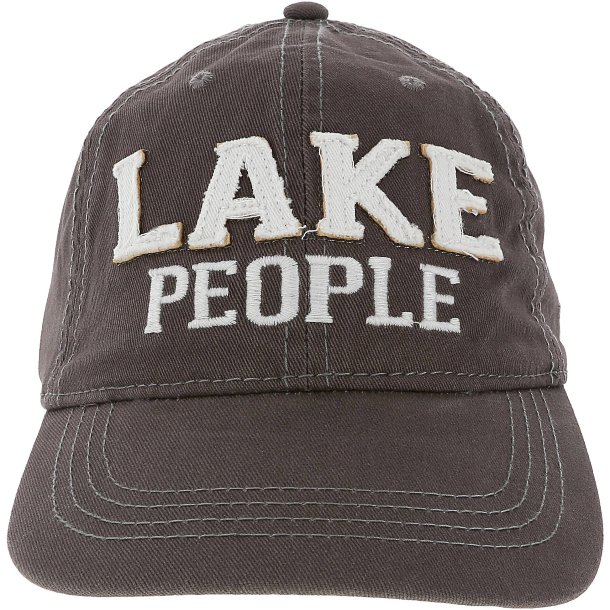 Hat, made from 100% high-quality cotton, comes packaged in a plastic polybag with a hang tag. A strap at the back of the hat allows for adjusting. "Lake People" text is embroidered and sewn-in with a frayed edge, as is the We People logo on the side of the hat. The brim features screen-printed text showing the "Lake People" logo. Wash by hand only with a damp cloth. Set out in the sun to dry. Great for those who want to show their love of the lake.