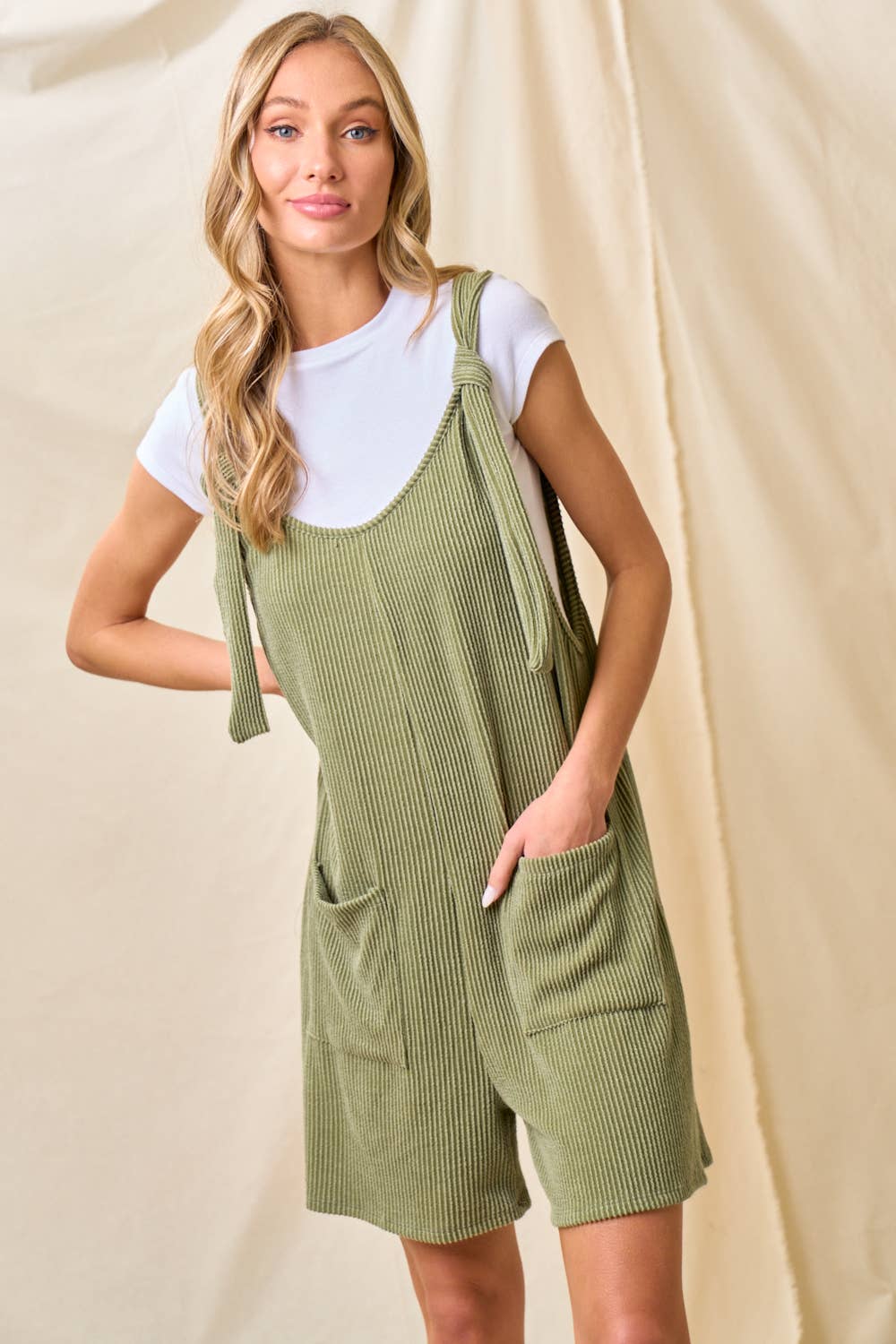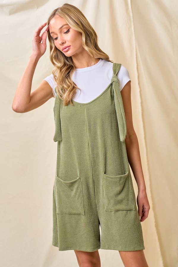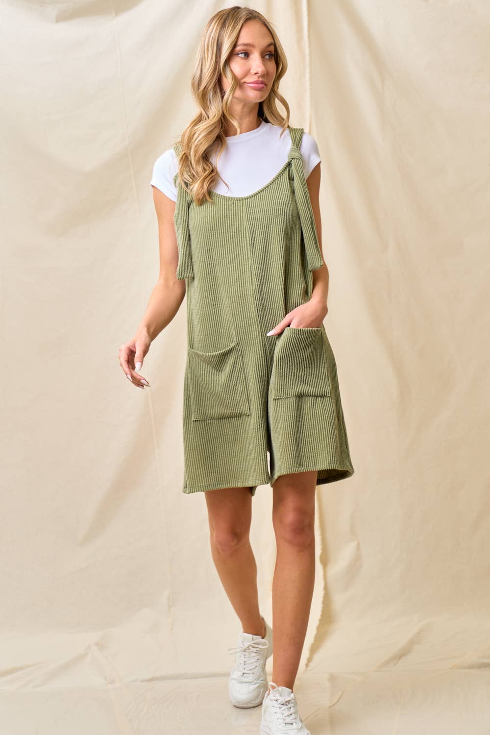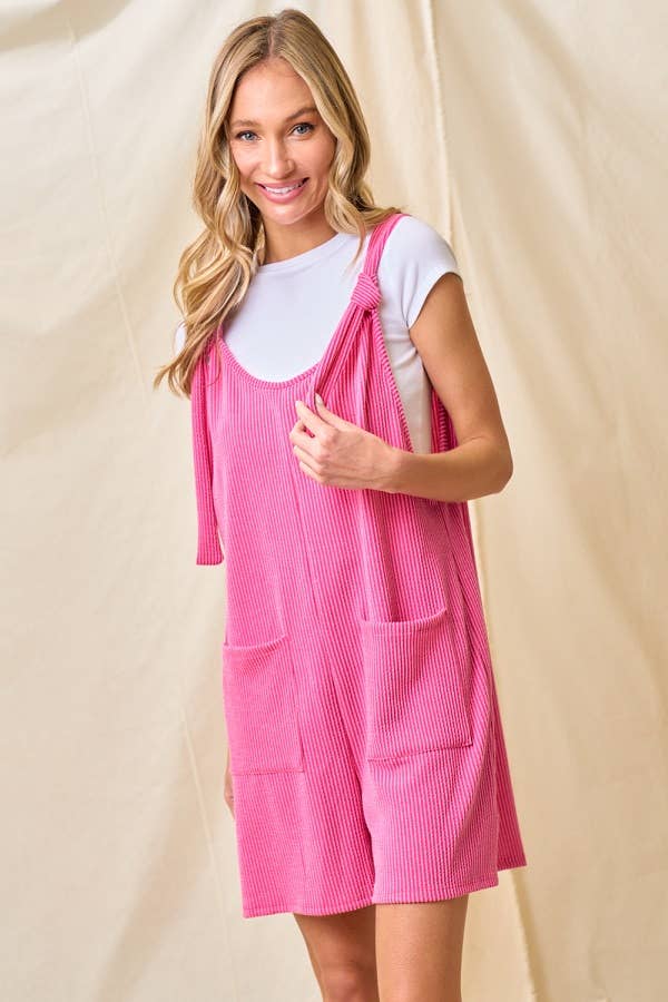 This romper is made of a rib material. Features an adjustable straps, short length, and has two front pocket details. Model/Picture information Height: 5'8 US Size: 2 Bust: 33" Waist: 25" * Model wears a size small* **