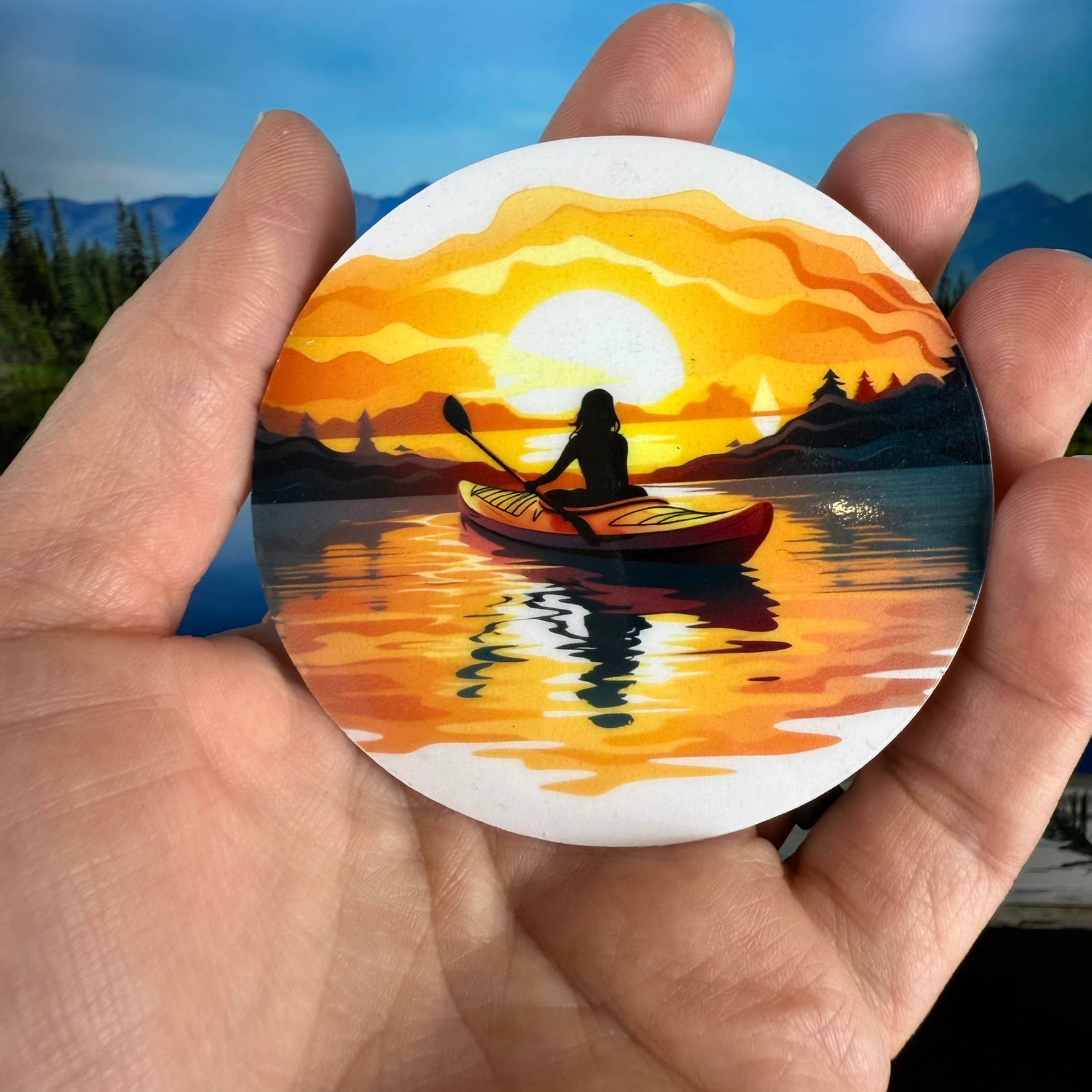 Drift into serenity with our "Sunset Kayaking" Sticker! This calming round sticker features a woman in a kayak gliding peacefully across the water, surrounded by the warm and vibrant hues of a stunning sunset. Perfect for lovers of kayaking, nature, and peaceful outdoor adventures, this design captures the beauty and tranquility of being on the water at dusk.