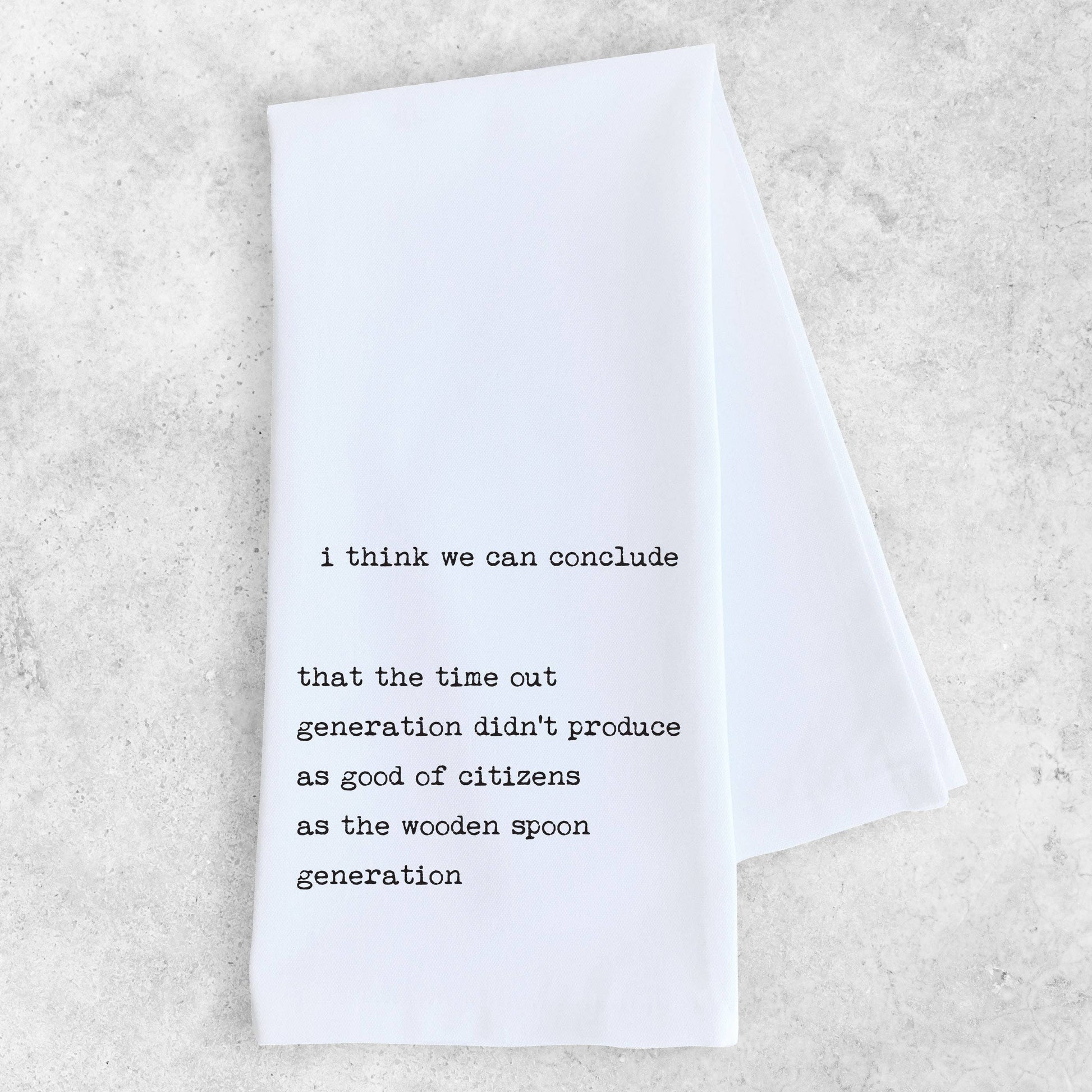 White with black text that highlights any decor - Machine washable and fade resistant - Individually wrapped in a minimalist band with towel name on it for easy display and the perfect gift! *(Packaging example for Mr. Rogers shown.)