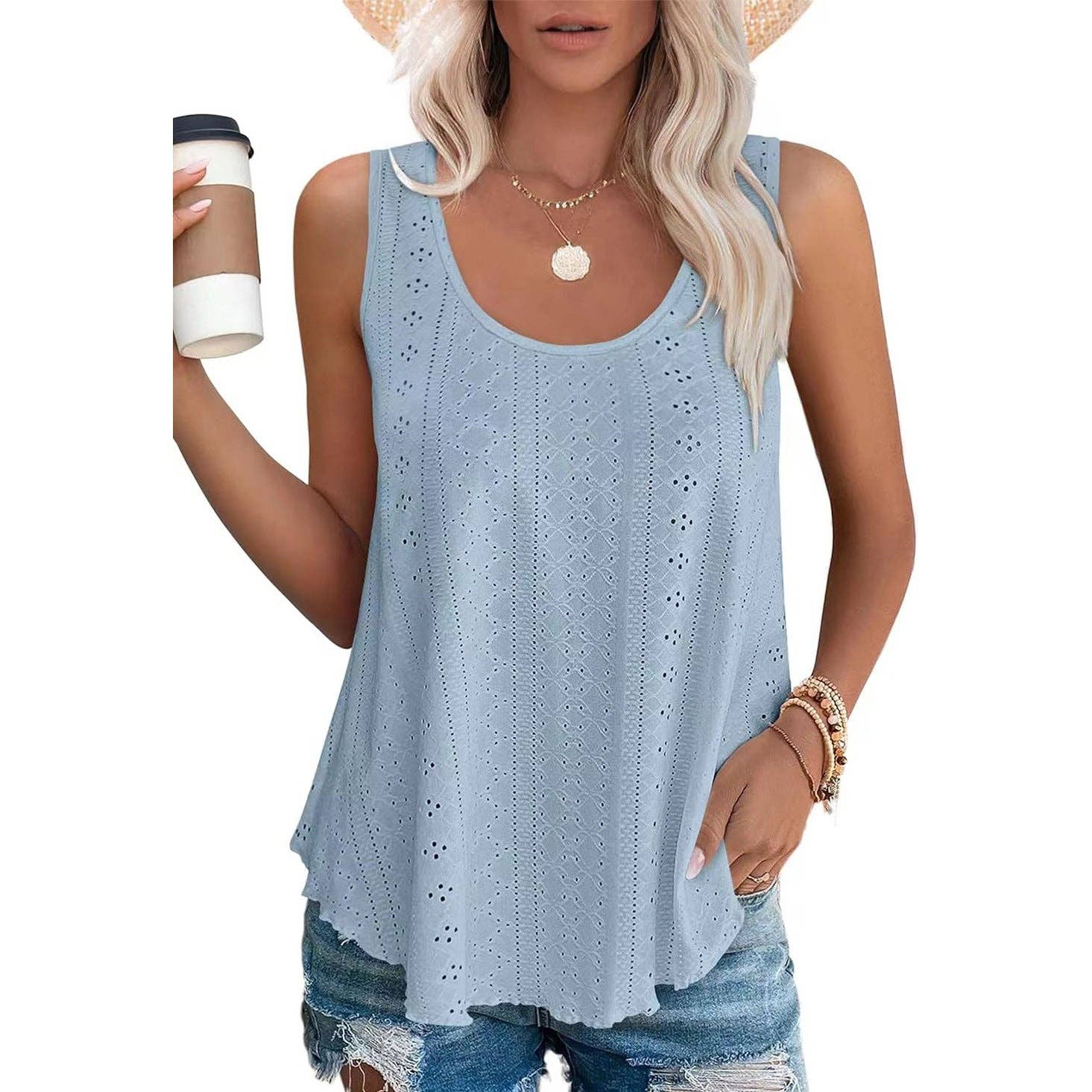 DESIGN This loose-fitting summer tank top features a round neckline and cutouts for a comfortable, flattering fit that also hides a small belly.
